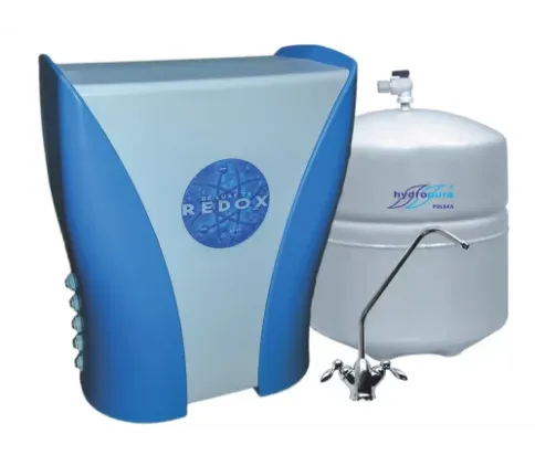 7. stopniowe urządzenie osmotyczne z membraną o wydajności 100 GPD. Zawiera 2 wkłady mechaniczne do filtracji wstępnej oraz 2 wkłady z węglem aktywowanym: wstępny (przed membrana) i końcowy. Dodatkowym elementem jest rezonator bioceramiczny do strukturyzacji oczyszczonej wody oraz Wkład REDOX służący obniżeniu jej potencjału ORP do wartości ujemnych (od -50 do -400 mV) oraz podwyższeniu pH. Urządzenie wyposażone jest w podwójny kranik umożliwiający pobór wody bezpośrednio po procesie filtracji lub mineralizowanej o zwiększonej alkaliczności i ujemnym ORP.